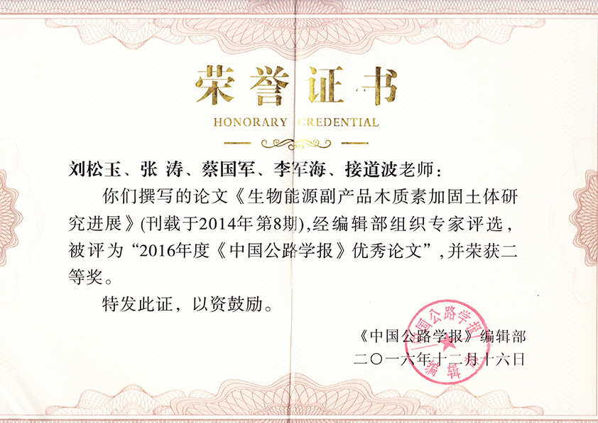 2016年度《中国公路学报》优秀论文奖
