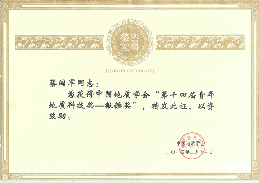 2013年第十四届中国地质学会青年地质科技奖银锤奖