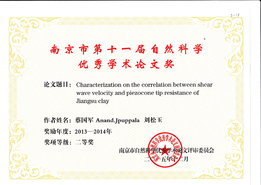 2015年南京市第十一届自然科学优秀学术论文奖