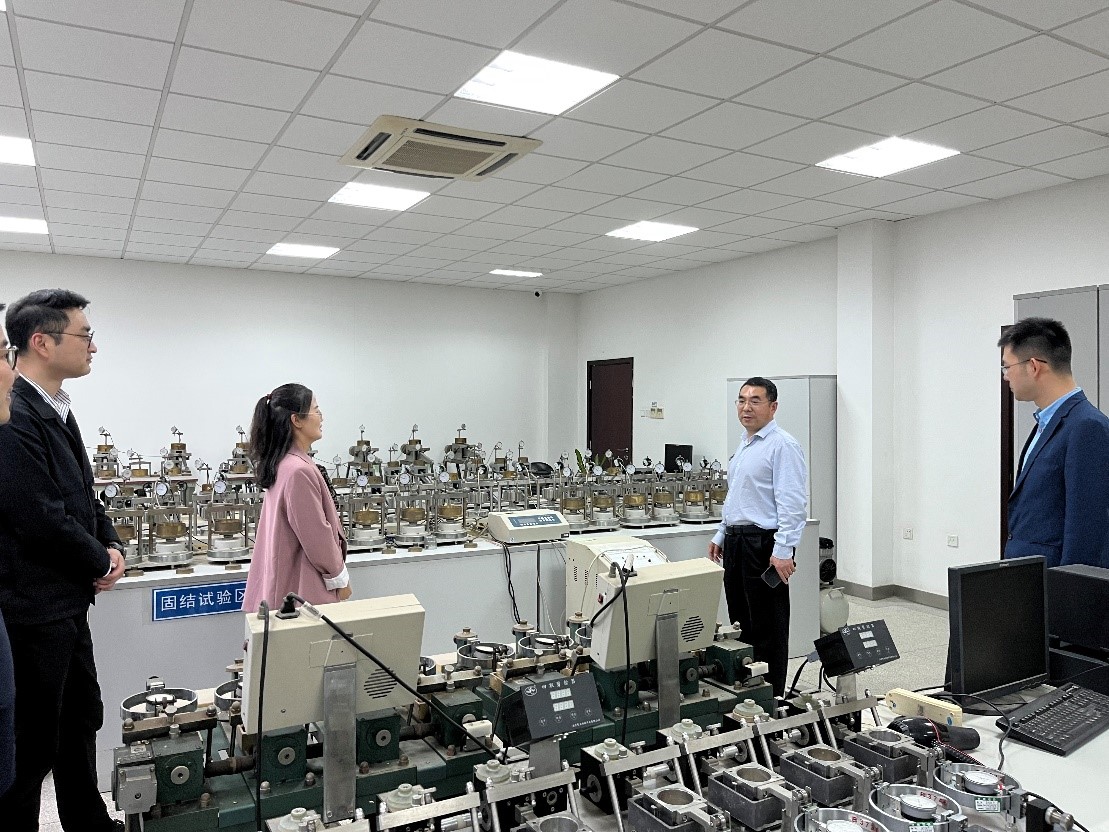 蔡国军一行与张从宝等安徽省电力设计院有限公司相关人员来到会议室进行座谈交流。座谈会上,蔡国军教授首先对安徽省电力设计院有限公司提供的校企交流机会表示感谢,并详细介绍了安徽建筑大学的发展历史、办学成效、人才培养、科研创新等。随后,蔡国军教授就岩土工程智能探测新技术作了精彩的学术报告,并介绍了我校安徽省智能地下探测技术研究院的建设情况。