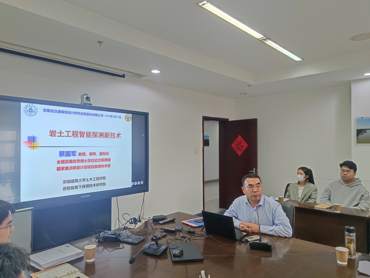蔡国军教授对安徽省交通规划设计研究总院的热情接待表示诚挚感谢,并应邀做了题为“岩土工程智能探测新技术”的学术报告。随后,详细介绍了安徽省智能地下探测技术研究院等科研平台的人才队伍、研究方向、仪器设备与已有成果等情况。
