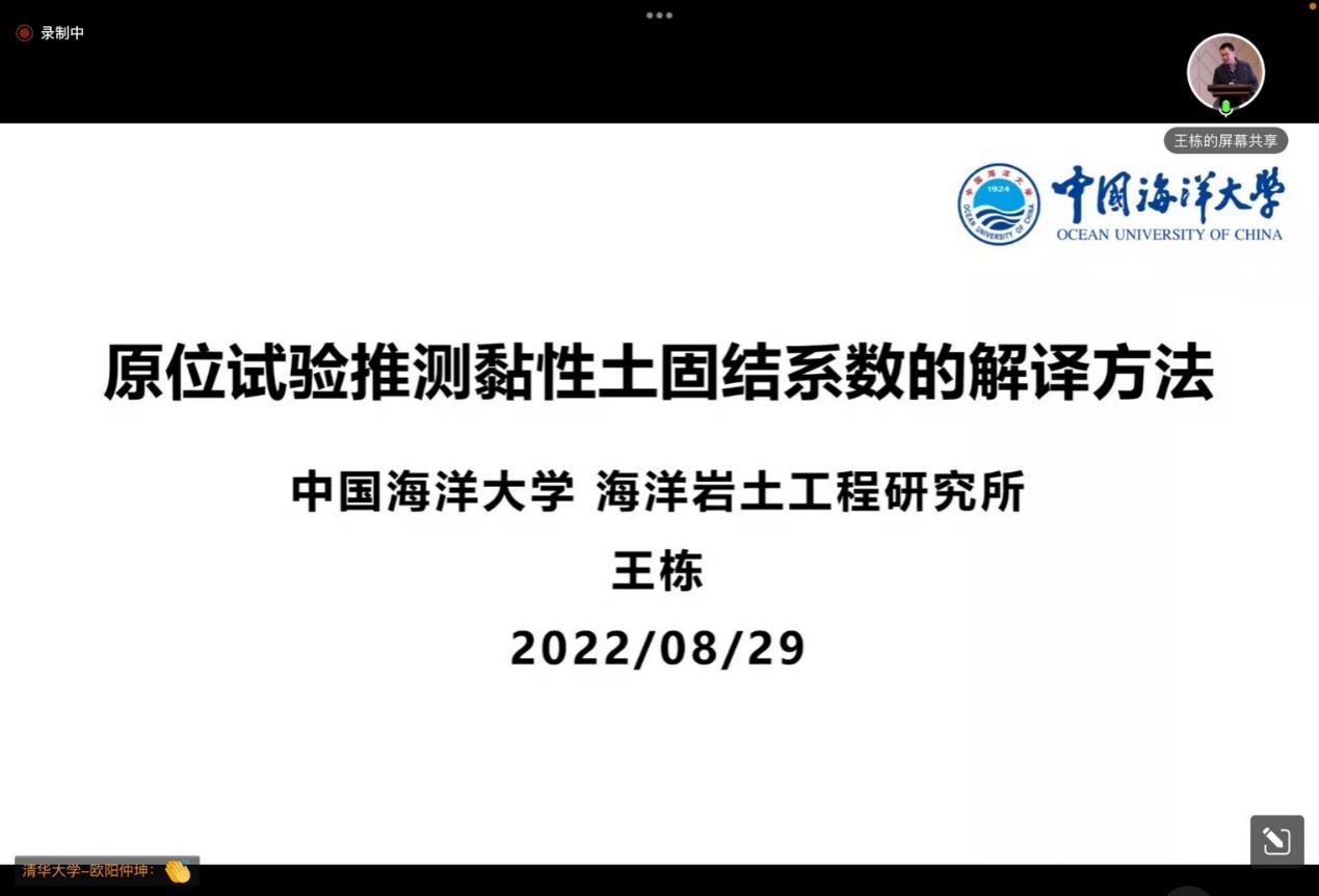 王栋教授报告题目为:原位试验推测黏性土固结系数的解译方法,报告从“海洋开发和海洋原位试验”“CPTU的孔压消散试验”“大变形有限元模拟”“不排水贯入和部分排水后贯入的消散试验解译”这5各方面对此次报告展开详细讲解论述。王栋教授用生动形象的图片配上文字讲解,使得看似复杂得原理变得清晰明了,在学术报告结束后,王栋教授对此次报告进行简短的总结,一是介绍了海洋工程勘察静力触探试验,二是CPTU数据应用及数值模拟方法,三是提出孔压静探消散试验确定固结系数的解译方法。在会议直播间里,有不少老师和同学积极提问,气氛活跃,王教授耐心负责为师生进行解疑答惑。