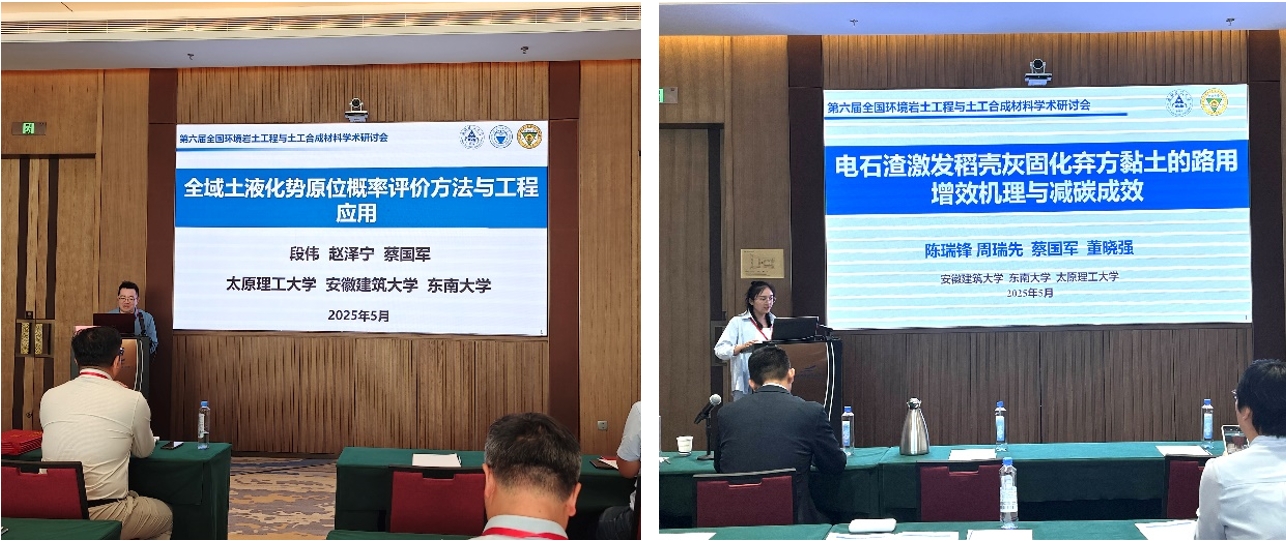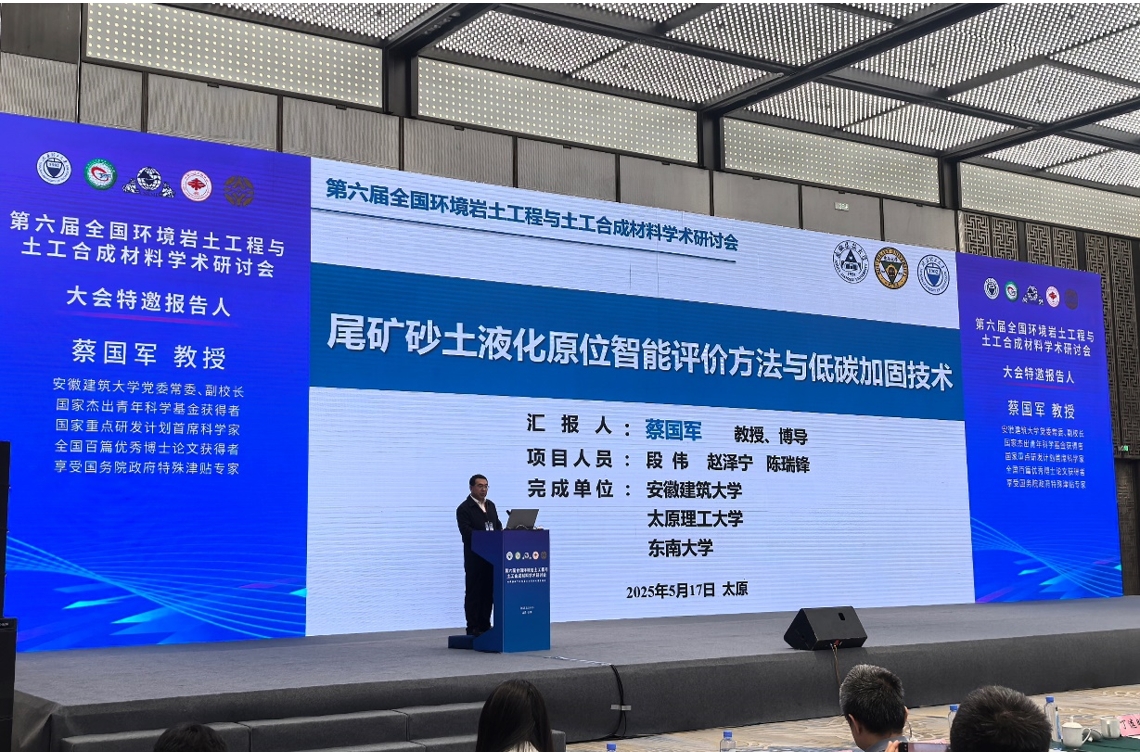 2025年5月16日至18日,“第六届全国环境岩土工程与土工合成材料学术研讨会”在太原召开。本次会议由中国岩石力学与工程学会环境岩土工程分会、中国土木工程学会土力学及岩土工程分会、中国土工合成材料工程协会主办,太原理工大学承办。中国岩石力学与工程学会环境岩土工程分会创会理事长、中国工程院院士刘汉龙等全国近百家高校、科研院所及企业单位的500余名岩土力学与工程领域专家学者齐聚一堂,共同交流环境岩土工程与土工合成材料领域新成果与进展,探讨新问题和迎接新挑战。校党委常委、副校长蔡国军教授及其团队骨干成员参加了此次学术研讨会,并作题为“尾矿砂土液化原位智能评价方法与低碳加固技术”的大会特邀报告。