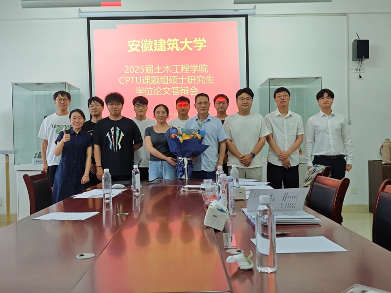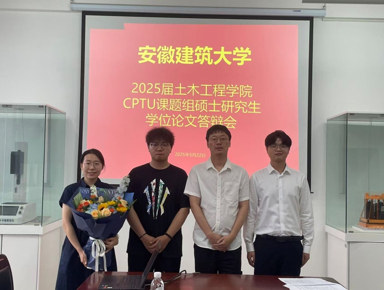 2025年5月22日,安徽建筑大学土木工程学院CPTU课题组在实训楼1502会议室举行了成新旭,陈凯,郑雅兰,吴掌乾四位硕士研究生的毕业论文答辩。