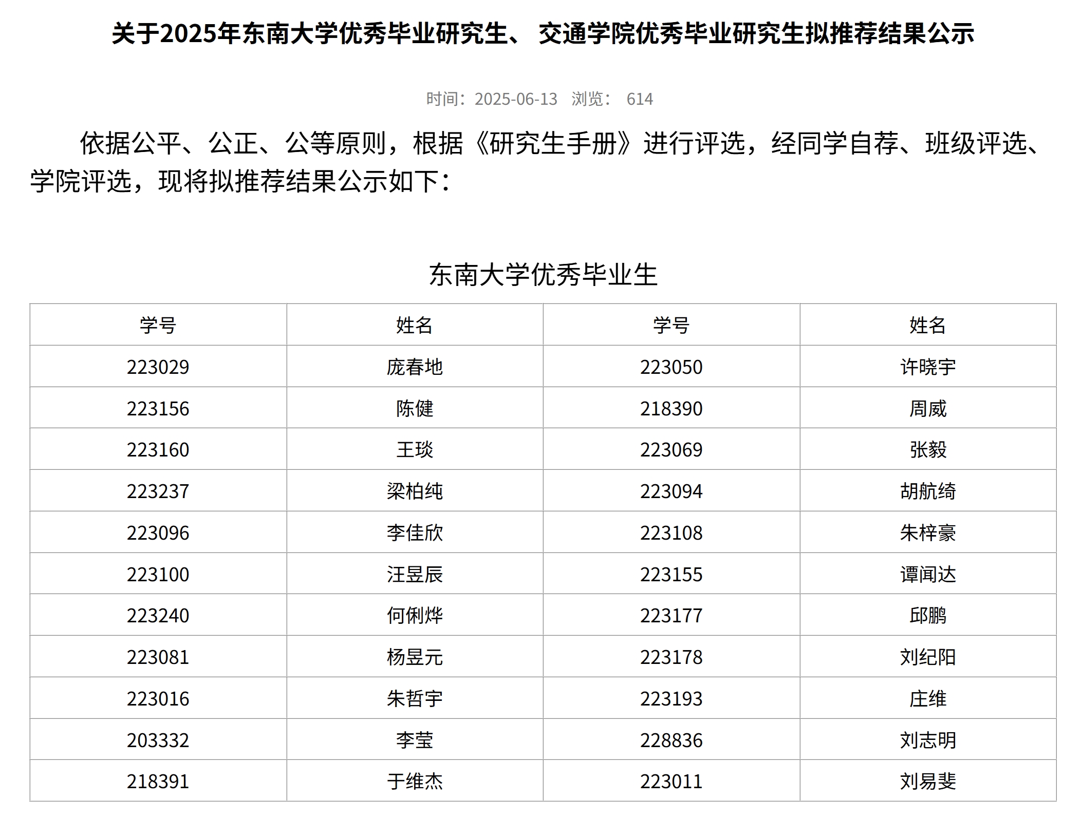 近日,东南大学交通学院依据公平、公正、公等原则,根据《研究生手册》进行评选,经同学自荐、班级评选、学院评选,公布了2025年度东南大学优秀毕业研究生的评选结果。本年度交通学院共评选出22位校级优秀毕业研究生、15位院级优秀毕业研究生,刘志明博士(导师:蔡国军教授)入选了2025年度东南大学校级优秀毕业研究生。