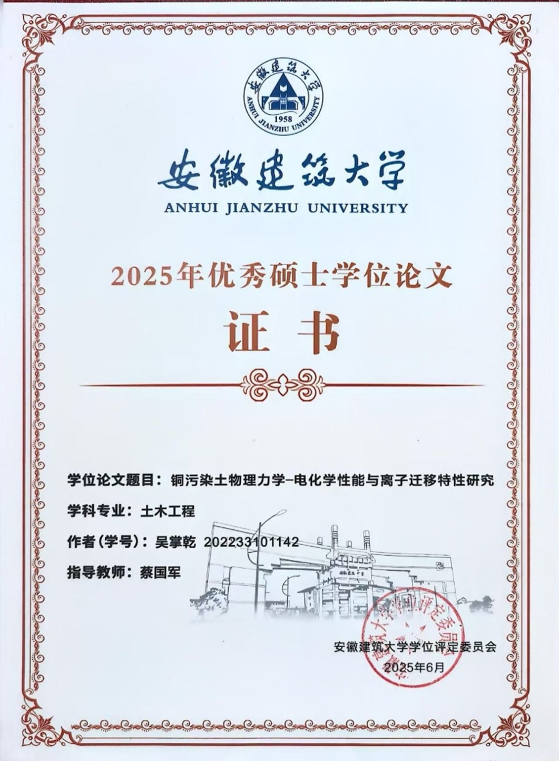 近日,安徽建筑大学研究生院公布了2025年度优秀硕士学位论文评选结果,吴掌乾同学(导师:蔡国军教授、段伟副教授)撰写的学位论文《铜污染土物理力学-电化学性能与离子迁移特性研究》成功入选,荣获“2025年度安徽建筑大学优秀硕士学位论文”。