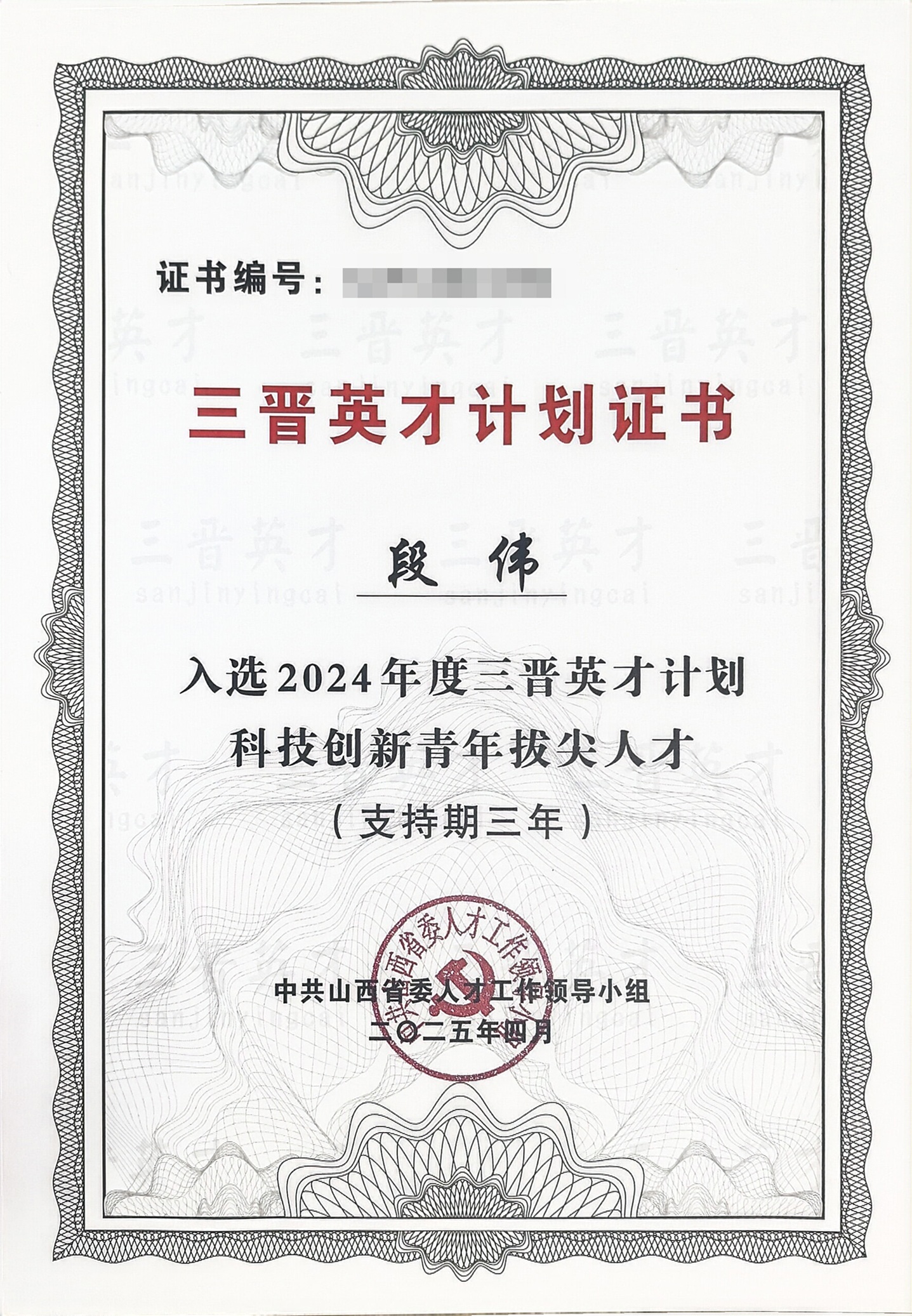 近日,山西省委组织部、山西省委人才工作领导小组公布“2024年度三晋英才计划——科技创新青年拔尖人才”入选名单。团队成员段伟副教授成功入选,荣获省级人才荣誉。